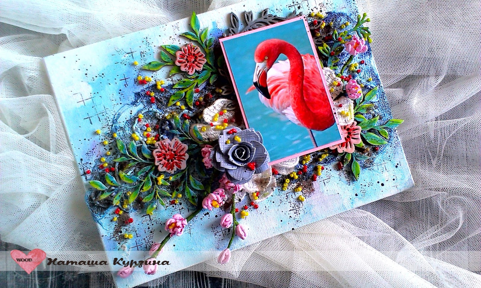 А я спешу вам показать свою работу, которую специально для этого сделала. Это миксмедийный холст "Розовый фламинго"